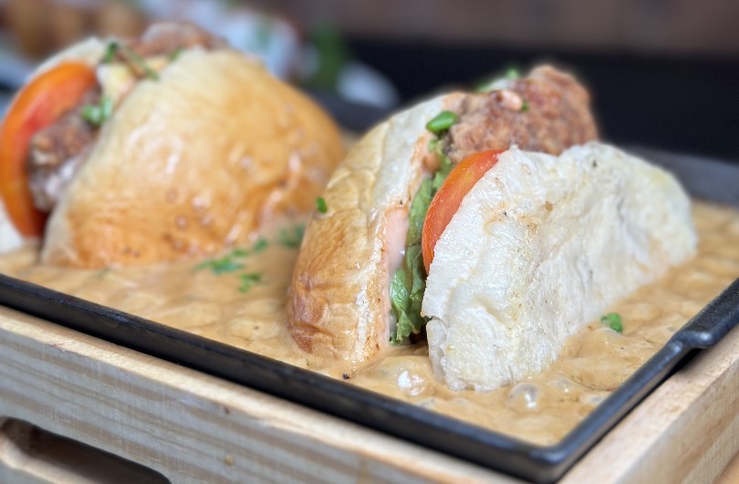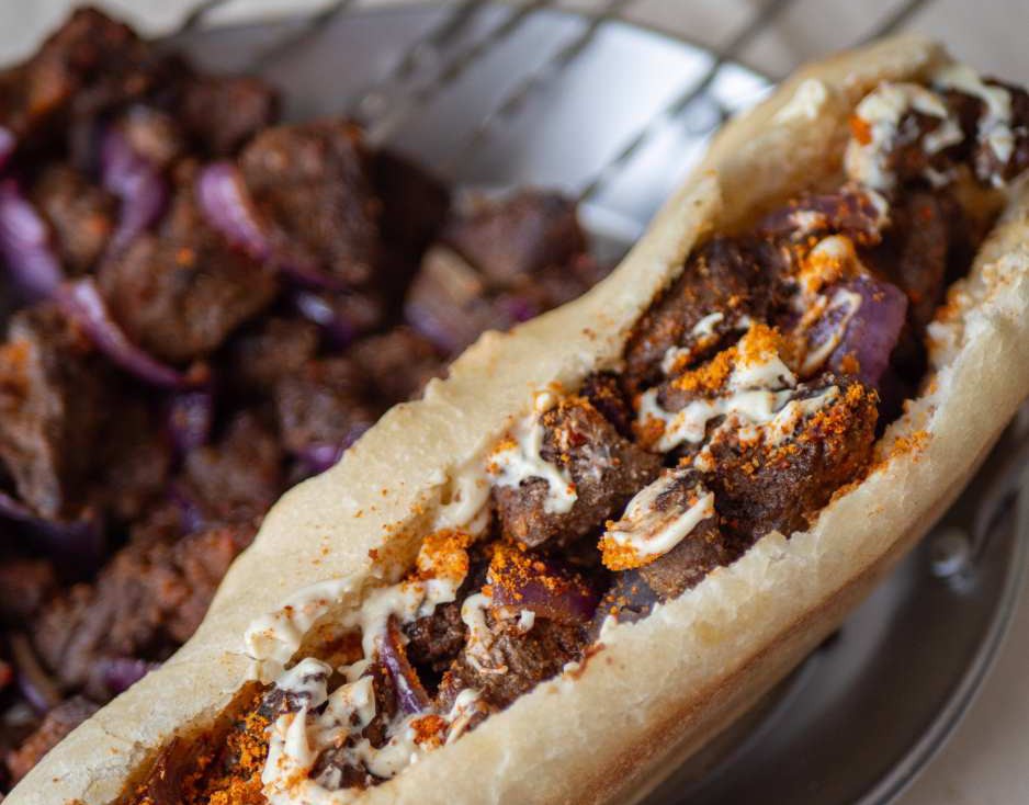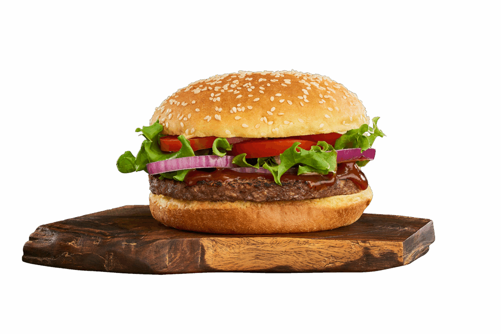 Steak hachée, sauce maison, tomates, cornichons, laitue, oignons